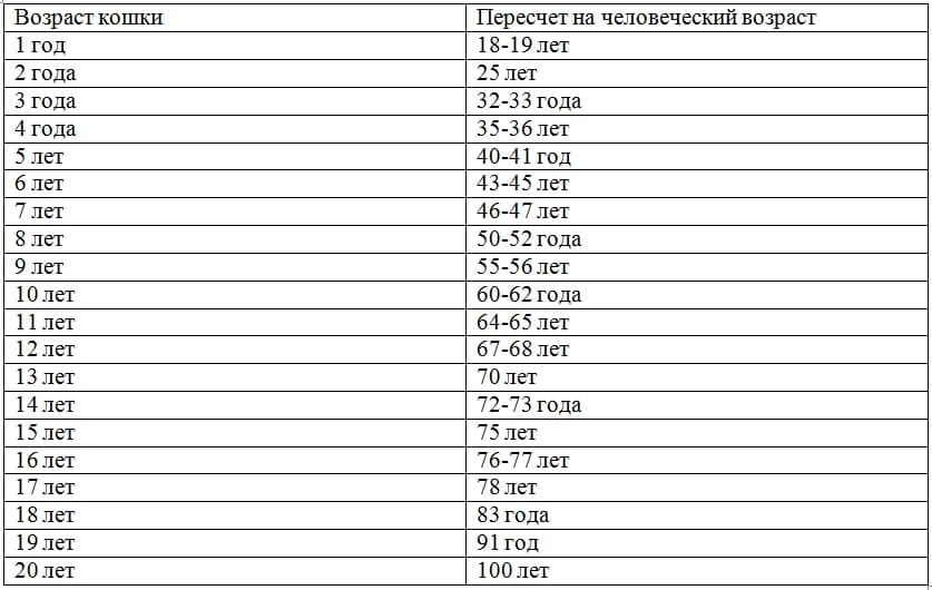 Именно основываясь на этих показателях, учёные составили таблицу, помогающую определить возраст кошки по человеческим меркам. Таблица: