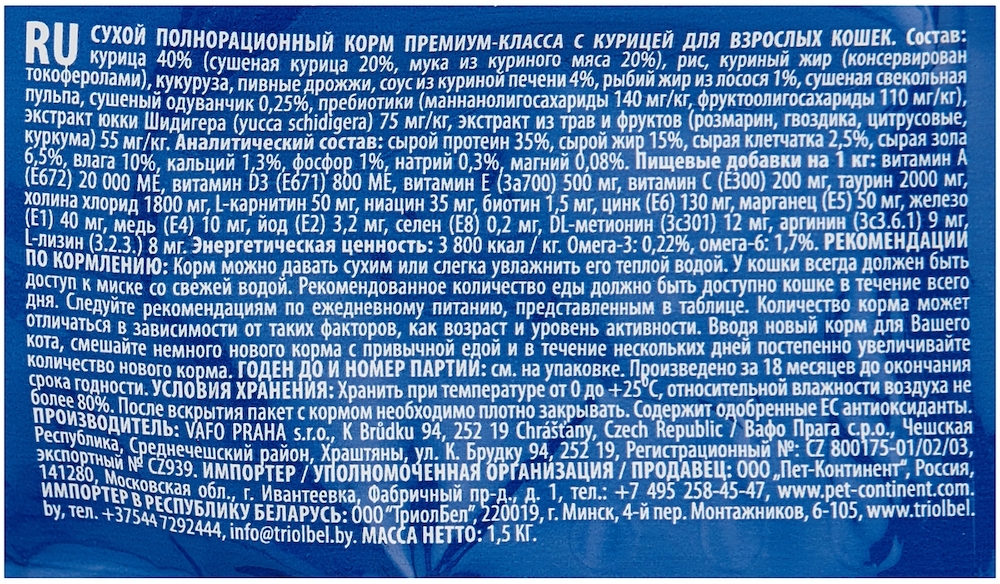 В состав данного корма включены добавки с Омега-3 и Омега-6 жирными кислотами, витаминами группы B, клетчаткой и пивными дрожжами. В качестве консерванта выступает витамин E.