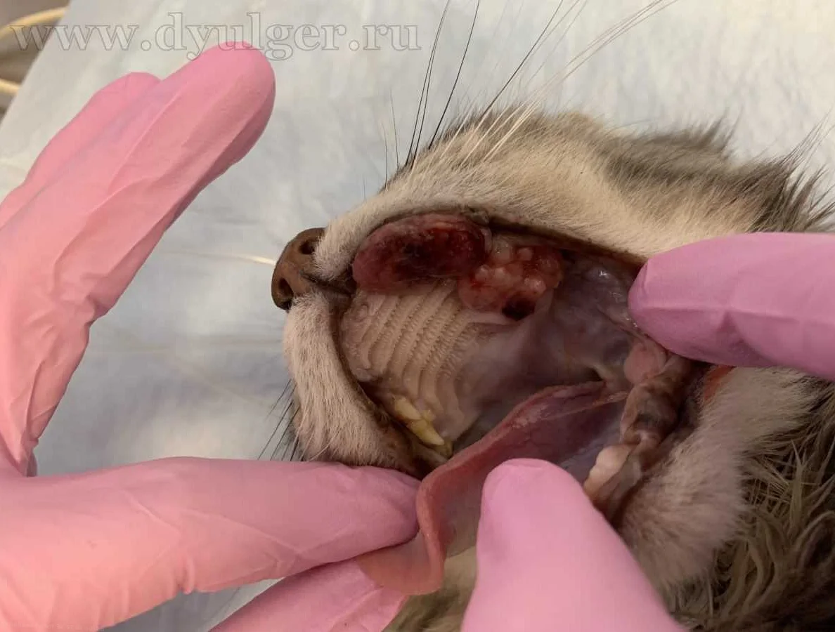 Такая онкология поражает ротовую полость кошки, может затронуть язык, нёбо, миндалины. При этом на слизистой образуются незаживающие язвы, появляется сильный и неприятный запах. По мере прогрессирования заболевания у питомца могут выпадать зубы, искривляются челюсти.