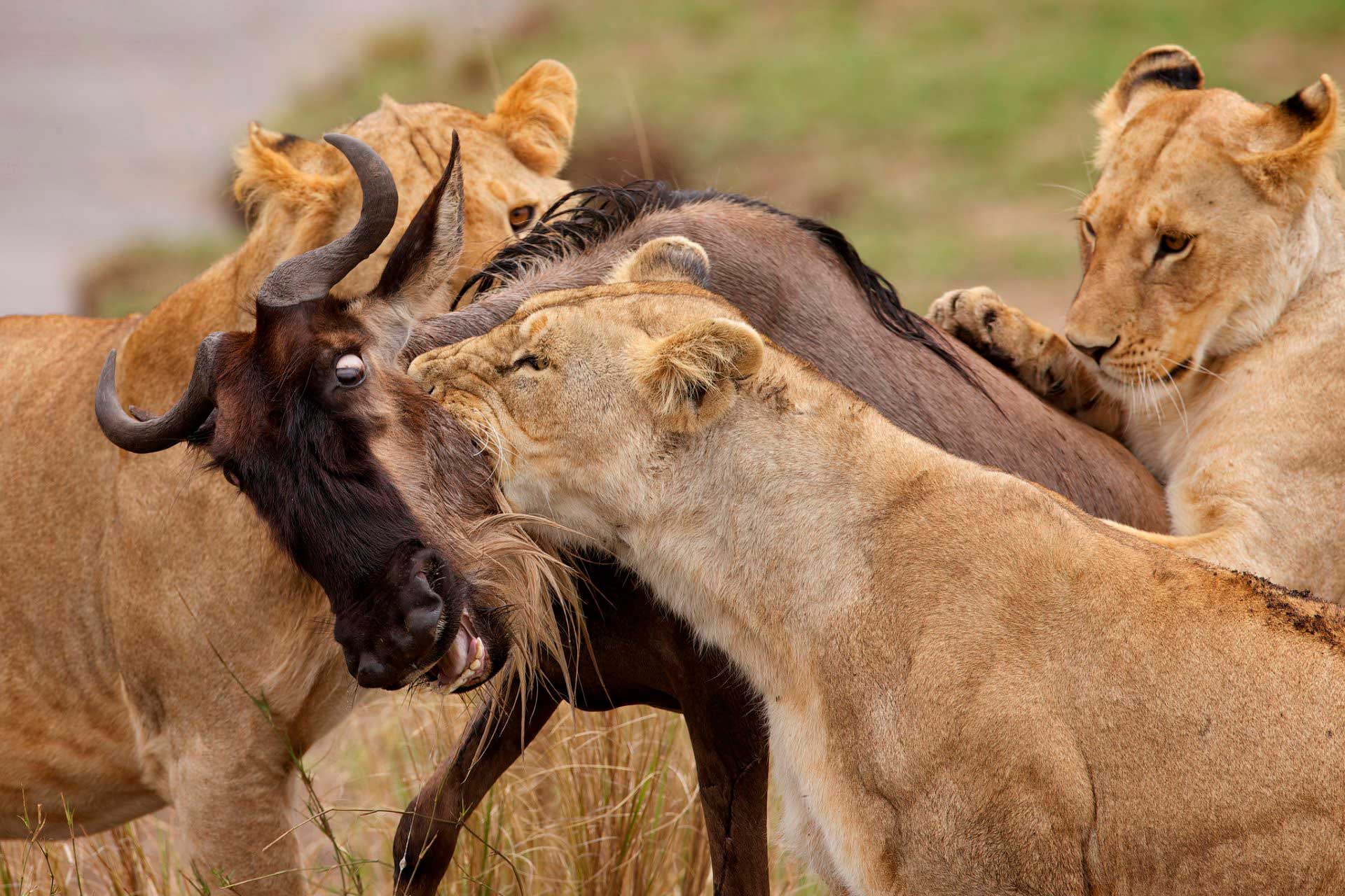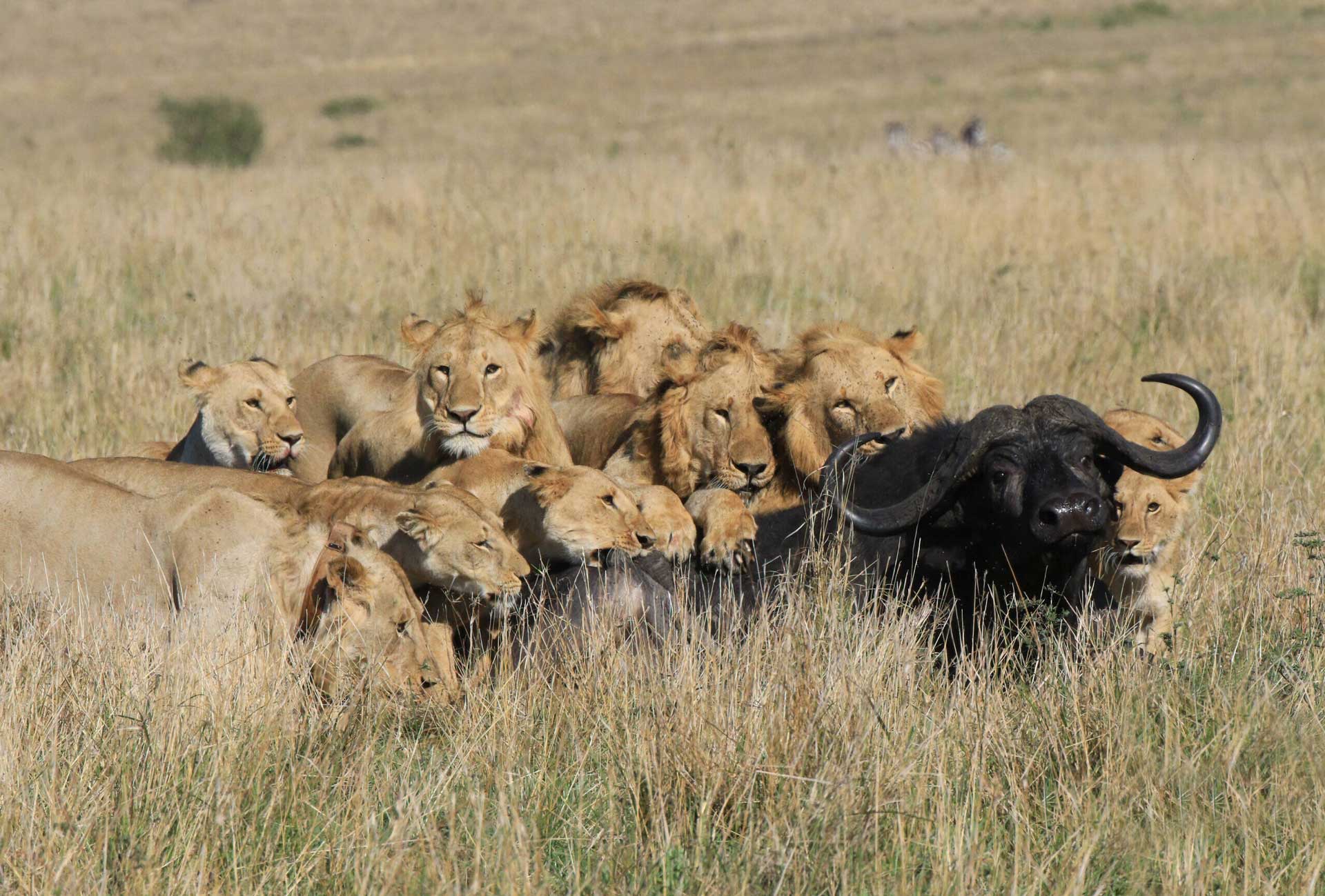 Охотятся львы групповым методом, однако принимают участие не все члены прайда. В особенности самцы редко принимают участие в охоте. Все дело в их гриве, она мешает животному оставаться незаметным. К тому же при интенсивных нагрузках грива будет способствовать перегреву животного. Поэтому в основном охоту проводят львицы.