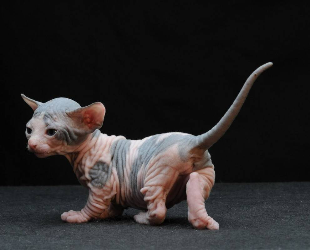 - Голорожденные (также называются резиновыми). Появляются на свет абсолютно лысыми, даже без усов, кожа липкая на ощупь. Могут также рождаться с очень короткой шерсткой, которая к двум годам полностью пропадает.