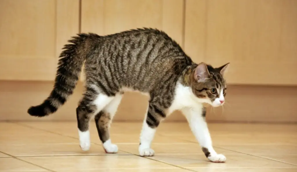 Испуганное животное прижимает уши к голове, поджимает хвост, мяукает, пытается убежать и спрятаться в безопасном месте. В редких случаях кошки, испугавшись, ведут себя иначе: выгибают спину, шипят, хлещут себя хвостом по бокам. При этом у них расширяются зрачки и они отводят назад уши. В такой ситуации питомец представляет серьезную угрозу для обитателей жилища. Не рекомендуется трогать его до тех пор, пока он не успокоится, иначе хвостатый монстр пустит в ход зубы и когти.