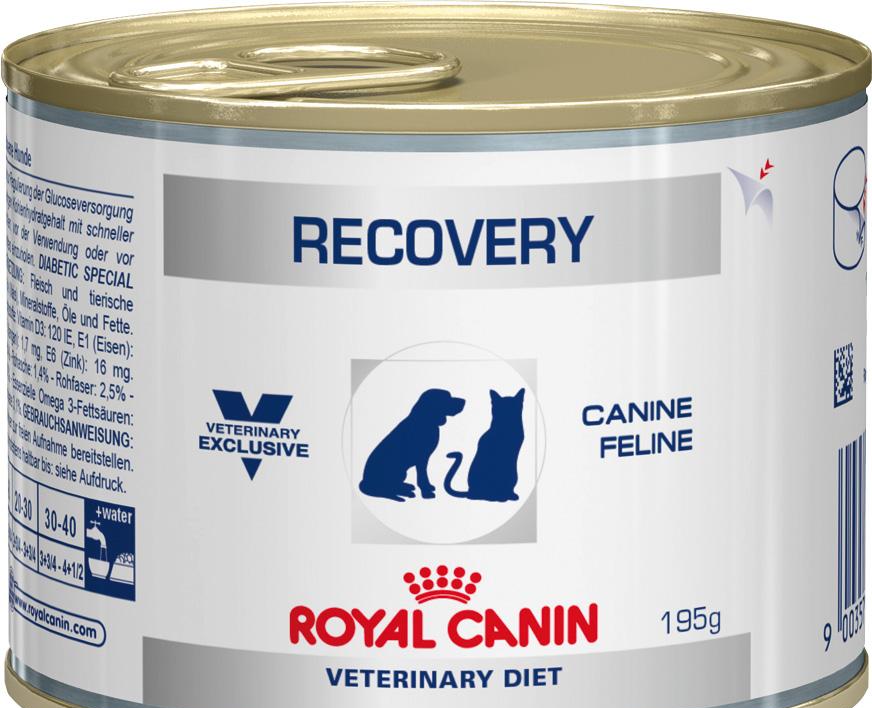 - «Royal Canin Recovery». Хорошо подходит животным с пониженным аппетитом – обладает хорошими вкусовыми качествами и высококалориен, поэтому даже маленький объем корма обеспечит питомца питательными веществами. В него входит комплекс антиоксидантов, защищающих клетки от окисления, способствуя укреплению иммунитета.