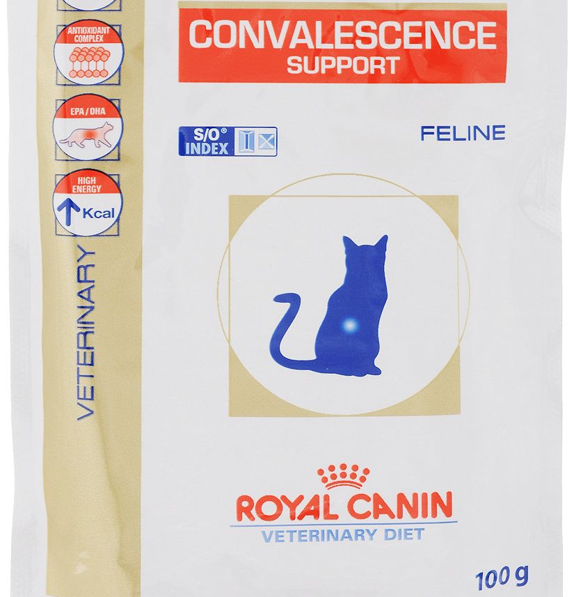 - «Royal Canin Convalescence Support Cat». Предназначен для восстановления после болезней и операций, подходит для истощенных животных. Позволяет быстро набрать мышечную массу за счет большого количества белка, обладает приятным вкусом, содержит антиоксиданты и хондроитин, улучшающий состояние суставов и хрящей.