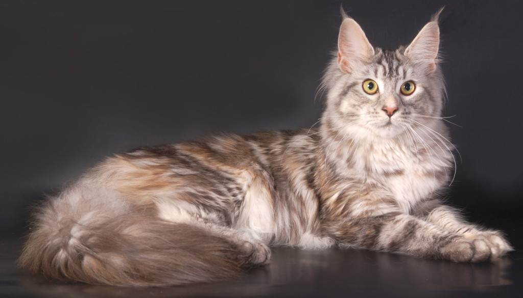 - Мейн-кун – создание родом из США ростом до 40 см в холке. Это самая большая порода в мире, которая любит простор. Живет она около 13 лет. Для нее характерен красивый пушистый хвост и кисточки на ушах. Характер у питомца независимый, но спокойный, уравновешенный.
