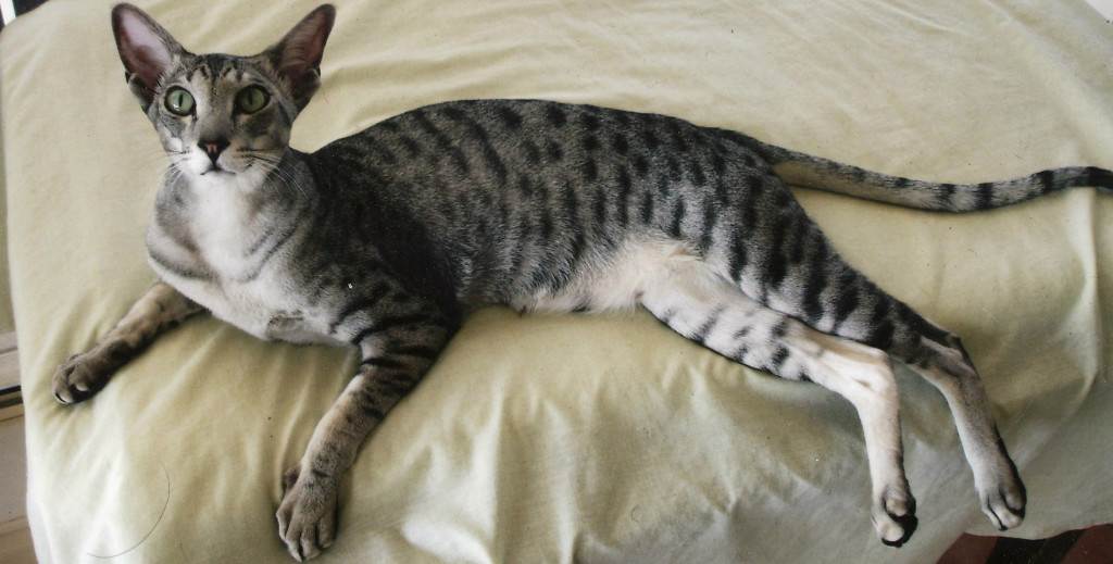 Выглядит порода довольно необычно. Главные особенности внешнего вида – красивое мускулистое тело, грациозные лапы и тонкий хвост. Миндалевидные глаза смотрят выразительно и загадочно. Основные плюсы разновидности – легкий уход, спокойное отношение к малышам, изобретательность и смелость. Ориентальная кошка не подойдет тем, кто мечтает о тихом друге, который будет мирно спать рядом. Она активна в течение всего дня и даже ночью. Цена в 15-25 тысяч рублей не всем по карману