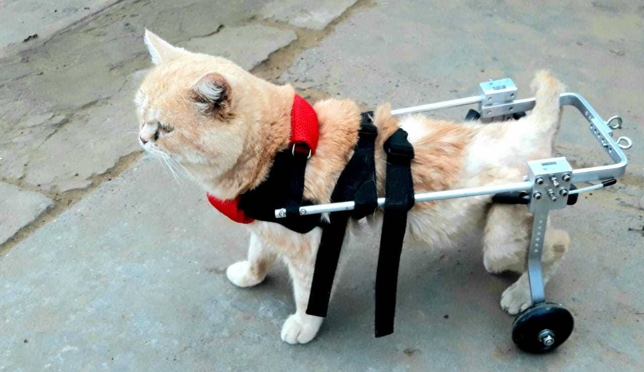 - Повреждение спинного мозга травматического и не травматического характера. При таком нарушении у кошки отнимаются лапы и теряют всякую чувствительность. Постепенно, если лечение не начато, ткани начинают атрофироваться и полностью утрачивают свои функции. Восстановление подвижности лап возможно не всегда, и в ряде случаев животному требуется коляска для нормального передвижения. Приспособление особым образом пристёгивается к животному, и кот, перебирая передними лапами, движется, в то время как задняя часть тела едет на коляске. Задние лапы подняты.