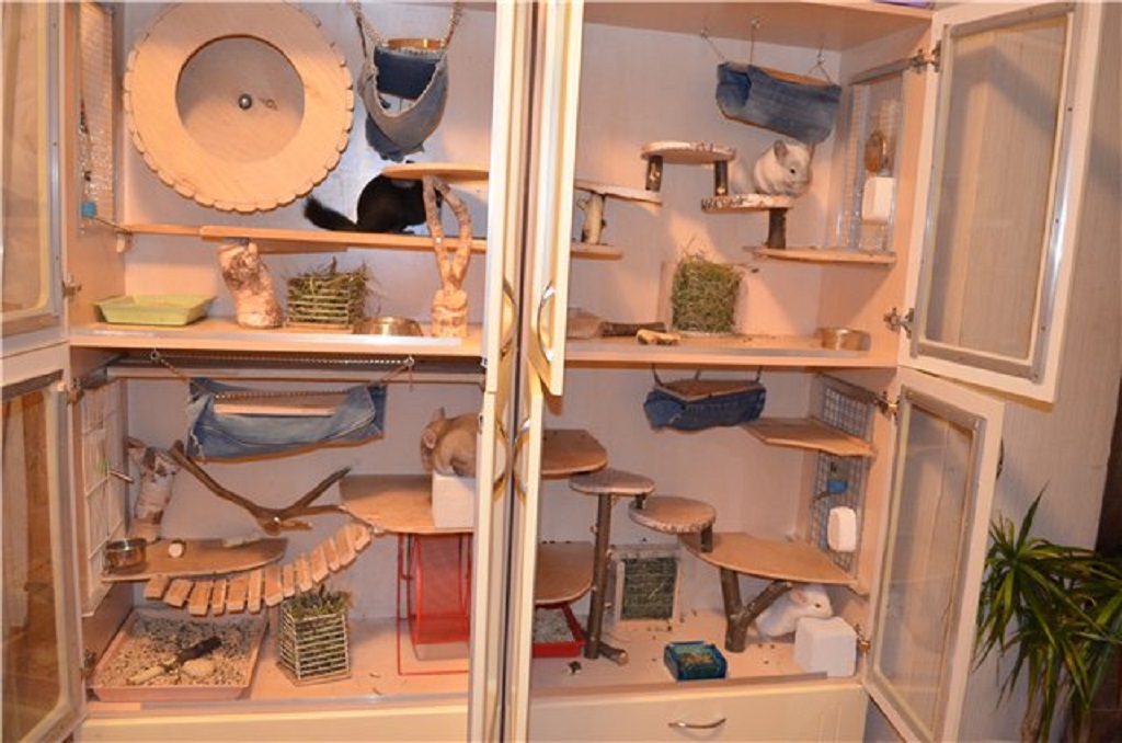 Для дома можно сделать клетку высотой 80 см. Но большинство шиншилловодов предпочитают делать клетку-витрину. Особенность витрины: высота значительно превышает ширину и длину. Боковые стенки могут быть затянуты металлической стенкой или быть полностью деревянными. Часто в витрину для шиншиллы переделывают старый шкаф. По этой же причине иногда витрина похожа на тумбочку.