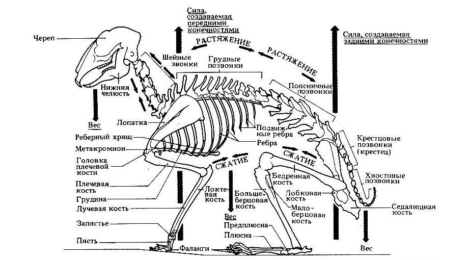 Скелет разделяется на осевой (череп, рёбра, позвоночник) и периферический (передние лапы, задние лапы).