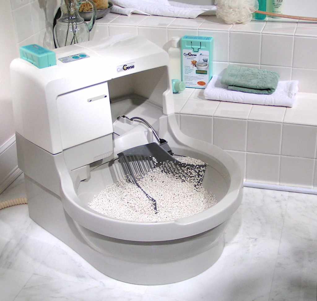- Cat Genie – один из самых дорогих автоматических туалетов. Он имеет вид унитаза круглой формы. В качестве наполнителя используются специальные гранулы. Модель работает от электропитания, а также требует соединения с канализацией и водопроводной системой. Механизм работы позволяет отдельно собирать жидкие и твердые отходы и смывать их в канализацию. После удаления мусора происходит очистка при помощи чистящих средств, поэтому распространение запахов полностью исключается. Удобство этой модели состоит в полной автоматизации процесса очистки, благодаря чему туалетом могут пользоваться одновременно несколько животных.