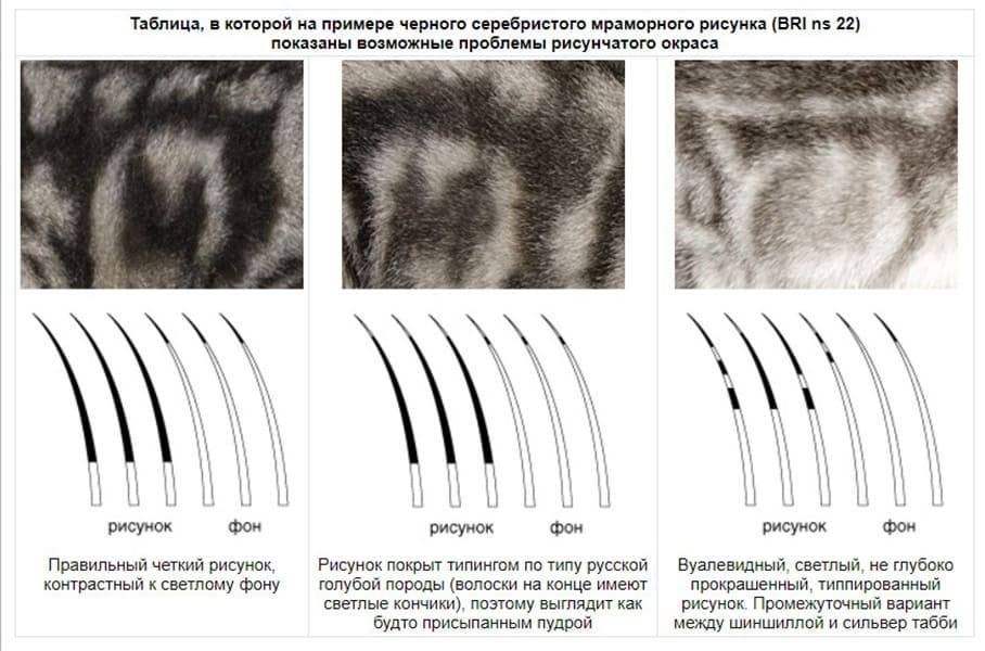 Ген Агути, отвечающий за наличие или отсутствие рисунков на шкуре кота, включает доминантный аллель А и рецессивный аллель а. Доминанта А означает наличие полосок, а рецессивный аллель – отсутствие полосатой расцветки. Коты с одноцветным окрасом black или blue обладают комбинацией «а», приводящей к «растворению» полосатости. При этом у отдельных особей могут проявиться остаточные признаки полосок, классифицируемые как «полосатый призрак». Базовая полосатая раскраска хорошо видна у таких молодых котят при ярком свете, а также у взрослых особей на хвосте.