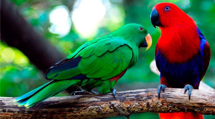 Эклектусов также именуют зелено-красными попугаями. Такое название связано с ярко выраженным в окрасе половым диморфизмом, столь редко встречающимся среди других видов. Самца и самку перепутать просто невозможно, настолько они отличаются.