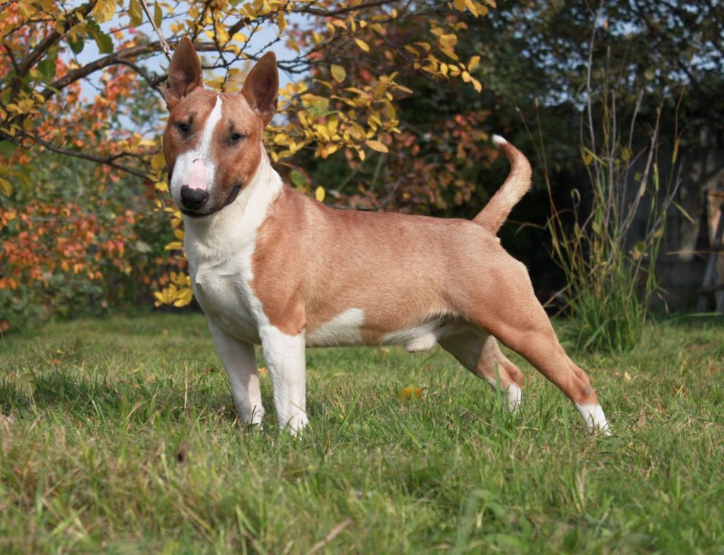 - Бультерьер. Рост до 50 сантиметров, вес до 55 килограмм. Отличается устойчивой психикой, что исключает беспричинную враждебность, агрессию, проявление злости. Нуждается в настойчивой, строгой, но при этом спокойной дрессировке. Правильно воспитанный пес представляет собой активного, выносливого, интеллигентного, надёжного защитника.