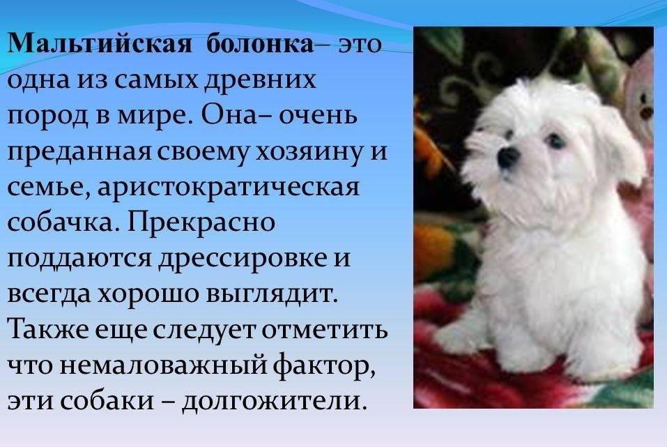 Интеллектуальные возможности мальтезе. Данную породу можно отнести к типу умных собак. Те, кто уже держит в доме мальтезе, с нами согласится, хотя необходимо отметить, что дрессировке собаки поддаются с большим трудом. Чтобы приучить их к элементарным командам, хозяину придется терпеливо повторять их сотни раз, пока питомец, наконец, не поймет, что от него требуют. Относительно этого можно добавить следующее, мальтийские болонки, слишком нежные создания, приспособленные больше для любви, а не для выполнения приказов и команд. Заводя в доме такую собаку, нужно заранее настроить себя на то, что собака в первую очередь компаньон.