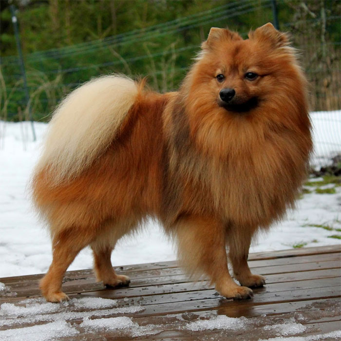 Пушистый воротник на шее и пышные штанишки на задних лапках отличают все разновидности немецких шпицев от других пород собак.