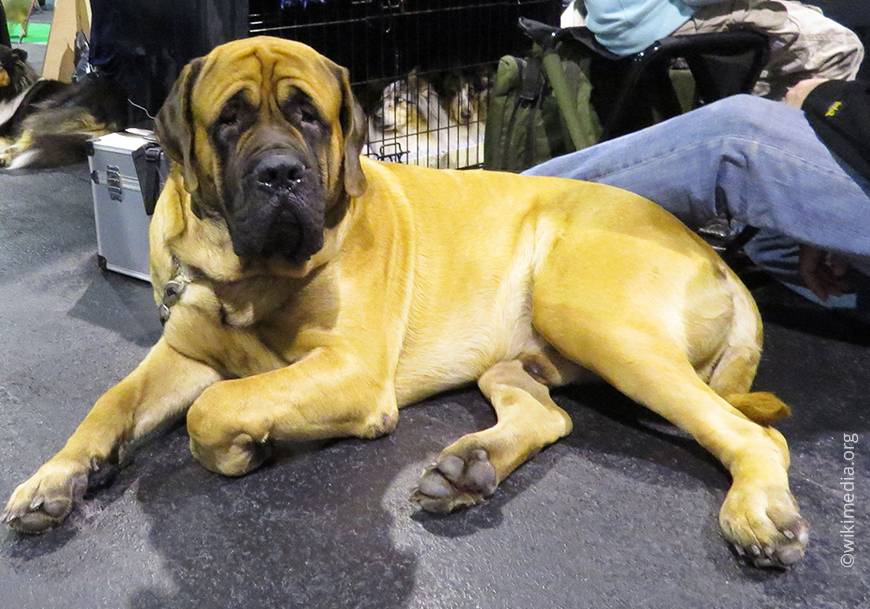 Еще один рекордсмен своей группы. Мастиф из Англии является самым большим из догообразных в Европе и самый крупный среди известных разновидностей мастифов. Породы очень схожи, бразильский и английский мастиф имеют схожий темперамент. Англичанин отличается более крупной и квадратной головой, манерой движения. Считается, что фила является обладателем более взрывного темперамента. Именно поэтому многие страны устанавливают ограничения на владение бразилейро, в отношении английского мастифа таких ограничений меньше.
