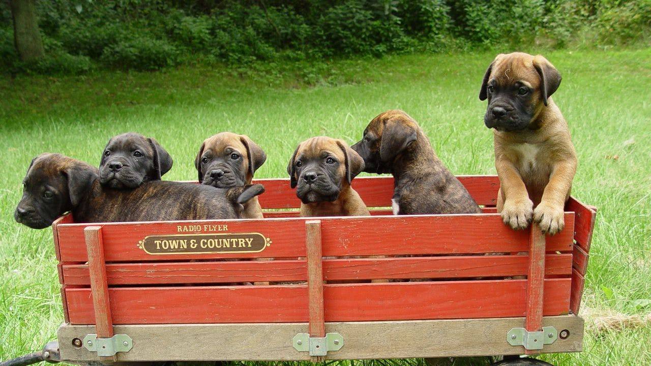 Щенок возрастом два месяца весит примерно 9 кг, возрастом три месяца – 17 кг (+/- 2 кг). Посмотрите на помет в целом, он должен быть ровным, без очень крупных и очень мелких щенков. Щенок бульмастифа возрастом 2-4 месяца должен быть: