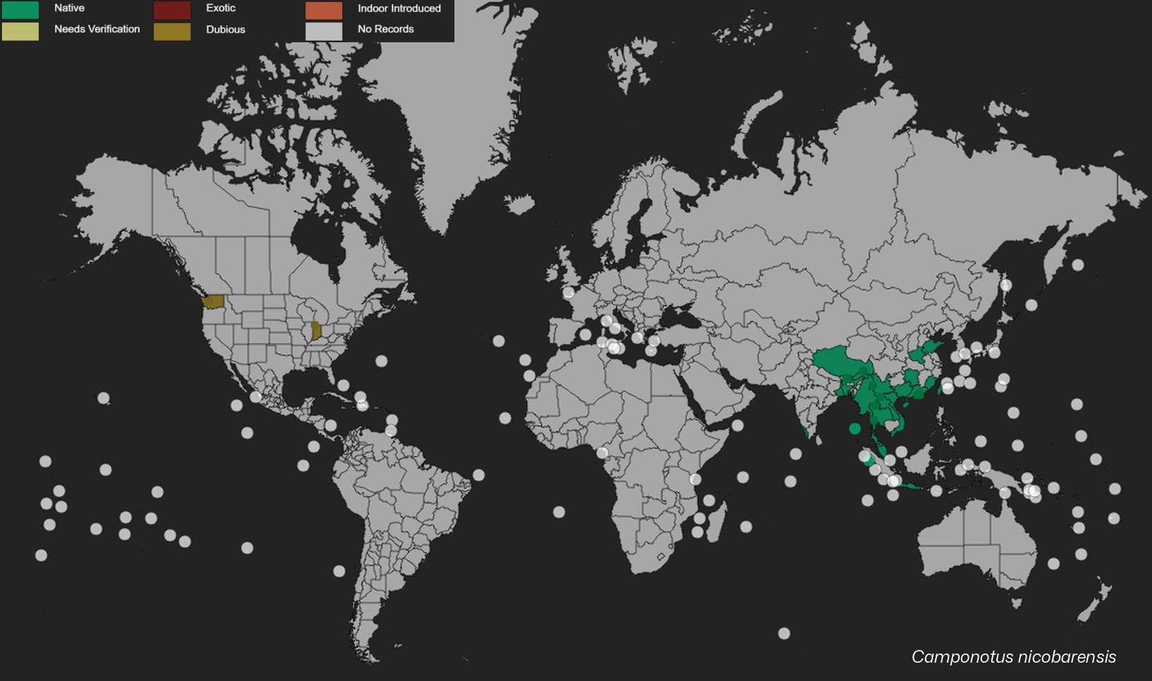 Camponotus nicobarensis Mayr, 1865 PDF: 31, pl. 1, fig. 1 (w.) INDIA (Nicobar Is). Indomalaya. Primary type information: Primary type material: syntype workers (number not stated). Primary type locality: India: Nicobar Is, Kar Nicobar (no collector’s name). Primary type depository: NHMW. AntCat AntWiki HOL