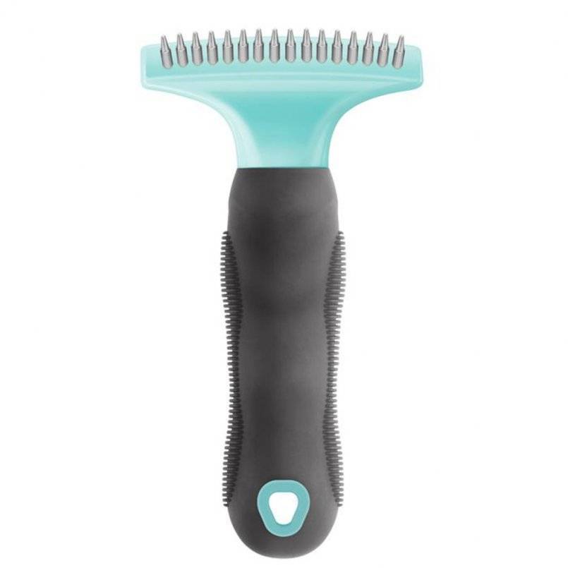 Модель представляет собой металлические загнутые зубья, расположенные на поверхности квадратного типа. Именно с их помощью происходит наиболее качественное вычесывание подшерстка.