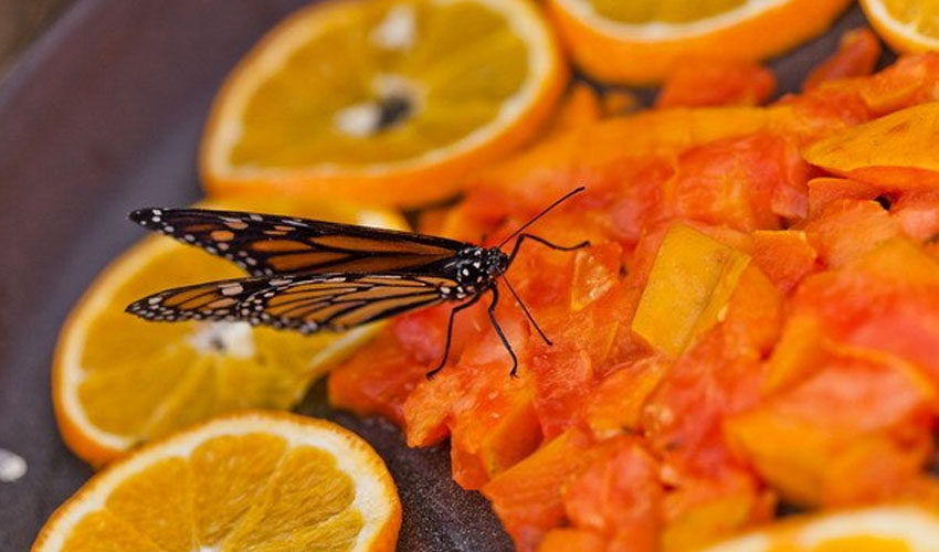 - Сок плодов, гнилых фруктов и овощей. Поглощение происходит через специальный хоботок - орган в строении бабочки, позволяющий беспрепятственно добираться до питательной смеси. Гнилые фрукты богаты водой, различными витаминами и сахаром. Подгнившие плоды декоративные едят бабочки в домашних условиях, но следует соблюдать определенные правила кормления.