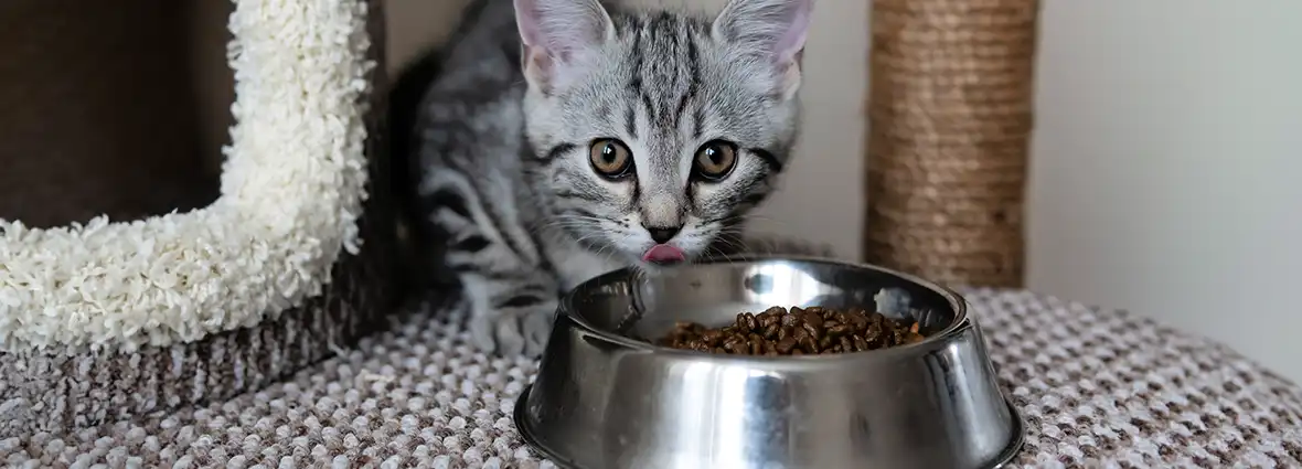 С 6 недель – питание котенка можно разнообразить сухим кормом для котят.