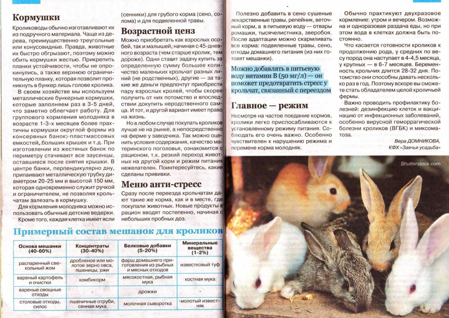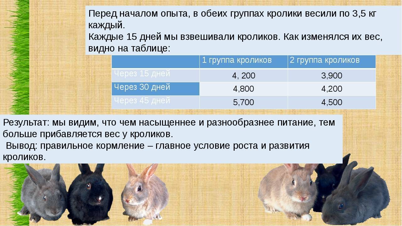 Критический период у крольчат длится около недели. Если малыши хорошо адаптировались к новым кормовым условиям, то в дальнейшим их уже можно кормить практически всем тем же, что и взрослых особей. В конце второго месяца они едят до 100 г кормовых единиц в сутки, третьего — около 150 г. К четвертому месяцу суточная норма молодняка может перевалить за 200 г корма.