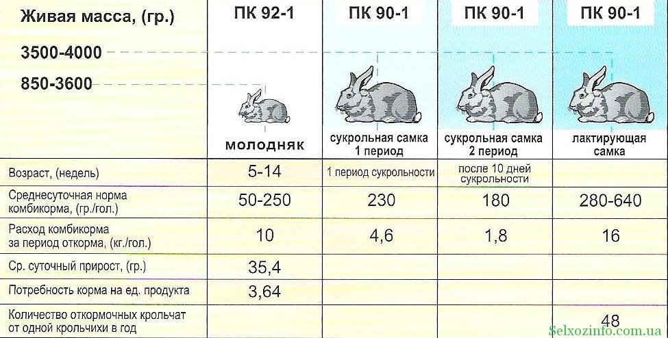 На 100 корм. ед. должно приходиться 16-18 г протеина. Большое количество корма, который ежедневно должна потреблять крольчиха, объясняется высокой питательностью и объемом (200 г) молока, производимого ею каждый день. Установлено, что к моменту отсадки крольчат, за период вскармливания, самка вырабатывает молоко, количество которого превышает ее вес в 1,5 раза.