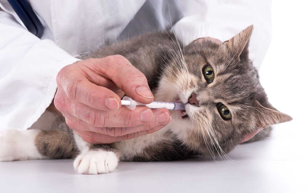 Больным кошкам обязательно давать их любимый корм и достаточное количество воды. Если питомец не ест, нужно кормить его принудительно. Для этого подойдет небольшая чайная ложечка. Ей набирают несколько кусочков влажного корма, заставляют зверя открыть пасть и вносят корм на основание языка. Дальше срабатывает глотательный рефлекс, и питомец получает необходимое количество пищи.