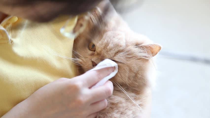 Сложно не заметить нагноения, образующиеся на мордочке питомца. Появление мутной вязкой жидкости, выделяющейся из глаз, является главным симптомом. Далеко не всегда гной проступает в больших количествах. Порой он подсыхает, образуя сероватые корочки, которые прилипают к шёрстке в области носа. Кошки, будучи чистоплотными существами, будут постоянно пытаться убрать эти образования.