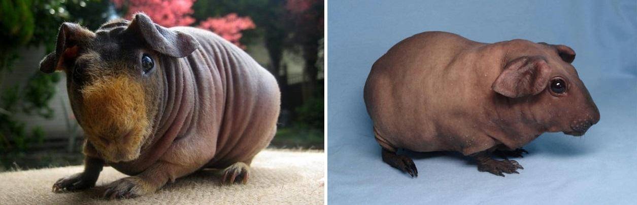 Морские свинки Болдуина полностью лысые и имеют гладкую кожу. Скинни носит мех на носу и ногах от рождения до конца жизни. Основная особенность ухода — соблюдение температурного режима и более разнообразное питание (рацион должен быть более калорийным, чем у других свиней). Подробнее о морских свинках смуф читайте в статье Baldwin Guinea Pig.