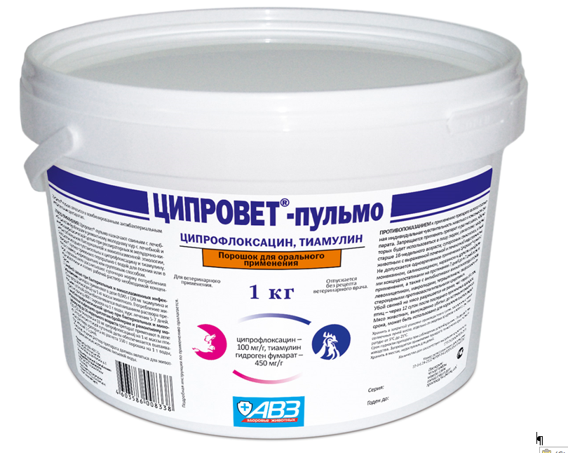 Порошок содержит 10% ципрофлоксацина, 45% тиамулина. Расфасован в банки, пакеты или ведра весом от 0,1 до 5,0 кг.