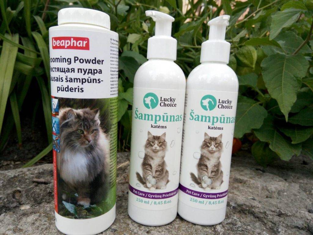 Сухие шампуни в виде пудры больше подходят для короткошёрстных котов, их легче удалить из шерсти. Применяют такие препараты и для длинношёрстных питомцев в местах, где шерсть небольшая (на папах).