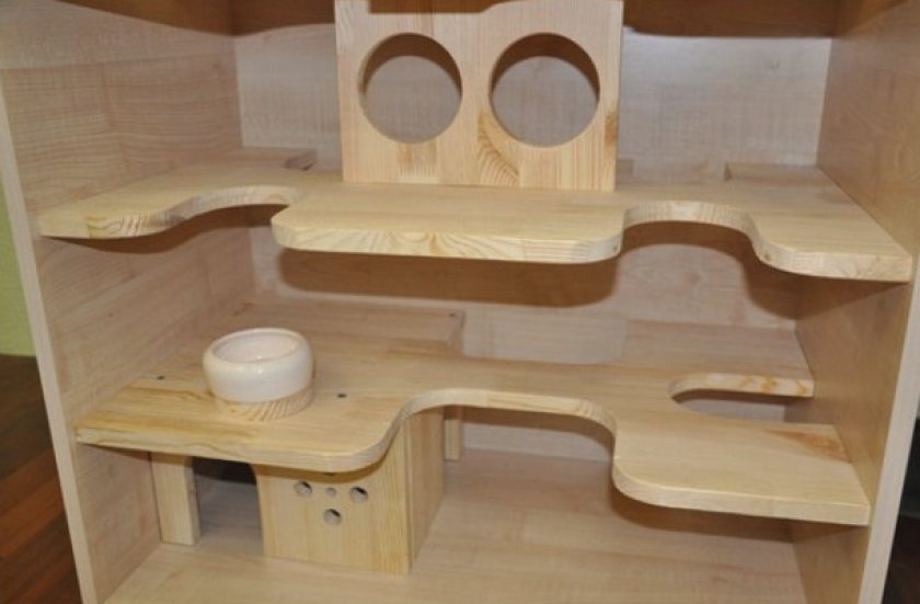 Ветеринары рекомендуют содержать подвижных животных в высоких конструкциях с обилием полок и лестниц, а также особое внимание следует уделить грызущим предметам. Клетка-витрина из дерева отвечает всем этим условиям, а также отличается удобством эксплуатации