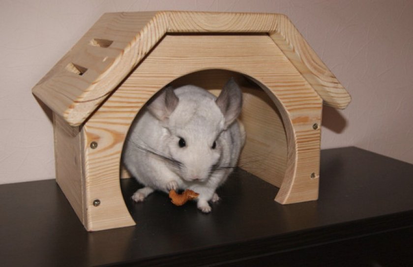 - Домик для отдыха. Его предназначение — уединение животного от посторонних глаз. Домик должен иметь размеры несколько большие, чем шиншилла. В нем она может находиться, вытянувшись во весь рост. Домик делается из дерева. Его также можно приобрести в готовом виде в зоомагазине.