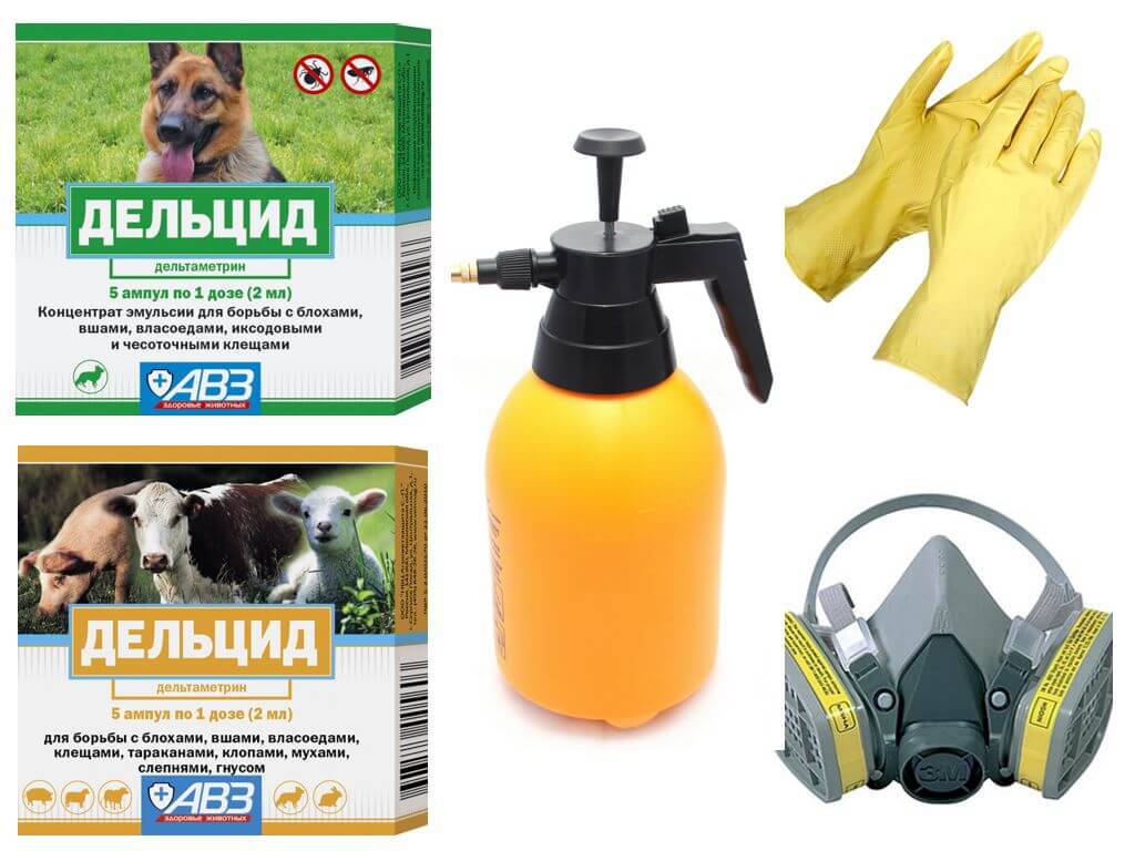 - Если в доме живет домашний питомец – обработка начинается с него. Избавить собаку от блох можно с помощью Дельцида. Средство применяется для крупнорогатого скота, овец, кроликов, собак. Как развести Дельцид для домашнего питомца, указано в инструкции.