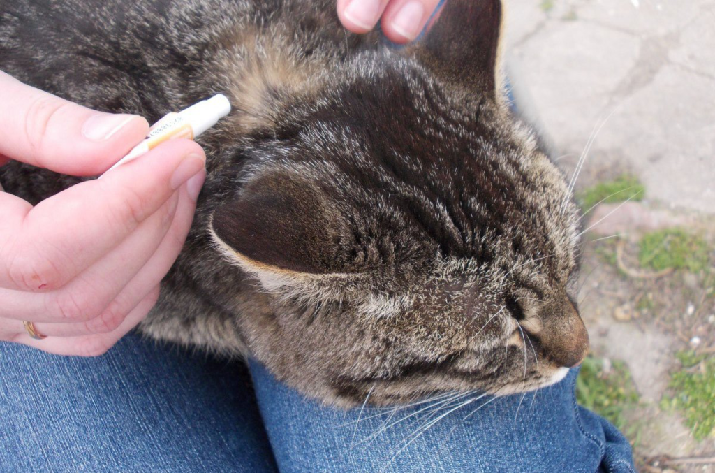 Капли наносят на кожу кошки в области холки. Для этого пипетку держат вертикально носиком вверх. Кончик аккуратно отрезают, раздвигают шерсть в области холки кошки и наносят капли непосредственно на кожу в нескольких местах, до которых кошка не дотянется при облизывании (между лопатками, на линию позвоночника).