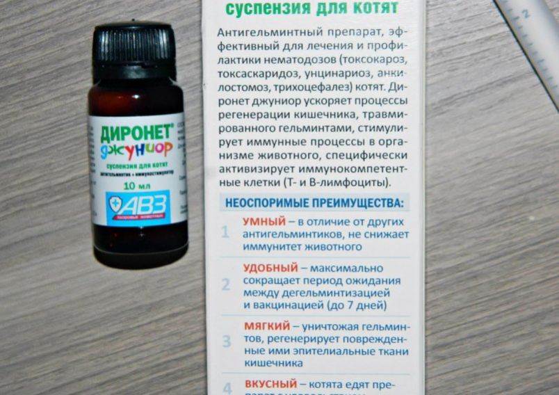 - 1 мл суспензии (Диронет и Диронет джуниор) рассчитан на 1 кг веса кошки. Если котенок весит меньше 0,5 кг, 0,5 мл лекарства разводят 0,3 мл чистой воды – необходимо брать кипяченую. Смесь требуется хорошо встряхнуть и только после этого давать питомцу.