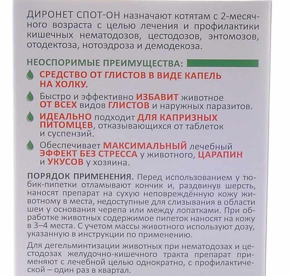 Диронет Спот он капают на холку кота с помощью пипетки, разделив шерсть на пробор. Предварительно следует срезать кончик пипетки и наносить средство, слегка надавливая на нее. Необходимо убедиться, что кожа на месте нанесения сухая и неповрежденная. Если животное крупное, средство в пипетке следует нанести в 3 разных местах. Это может быть кожа между лопатками или на шее, главное, чтобы кошка не могла ее вылизать. После лечения нельзя купать кота в течении как минимум 4 суток.