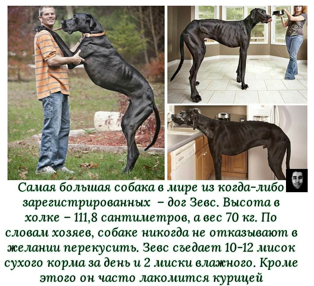 Немецкий дог по кличке Зевс получил почетное звание в 2013 году, на тот момент его габариты в 111.8 см роста и 70 кг веса, были рекордными.