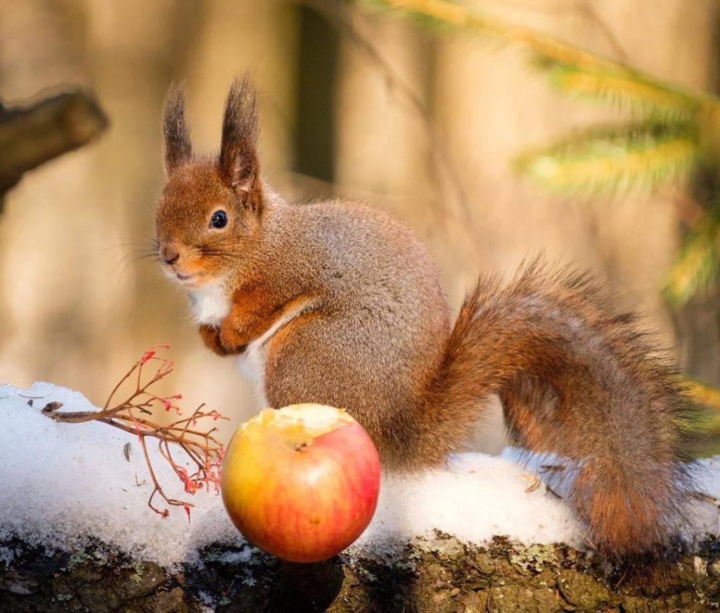 Белок зимой смело можно подкармливать нежареными семечками, орехами, сухофруктами, несолёным салом, можно в кормушку класть обмазанное мёдом печенье или же немного нежирного мясного фарша, а также нежирного творога.