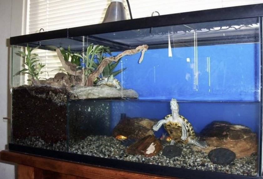 Жилище. Для этого потребуется стеклянный резервуар с донной плоскостью от 60 х 45 см — для молодых животных, и от 80 х 45 — для взрослой черепахи. Правило «чем объемнее — тем лучше» тоже применимо к акватеррариумам. Чем больше размер жилища, тем меньше оно пачкается, что позволяет иметь стабильные параметры воды.