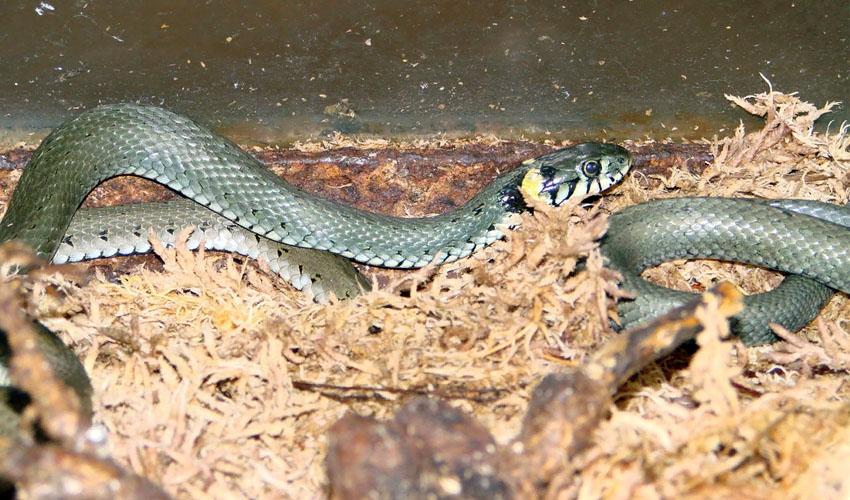 Ужи любят укрываться во мхе, так что позаботьтесь, чтобы в террариуме помимо грунта был уже и мох. Так вашему питомцу будет всегда спокойно и комфортно (уже зарываются в мох). (См. также: Как стать русалкой в домашних условиях)