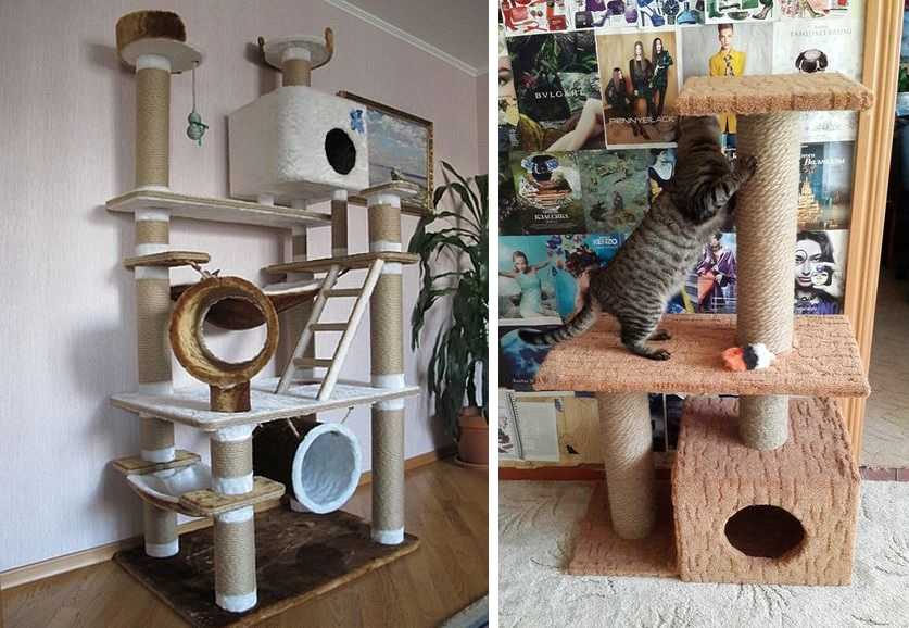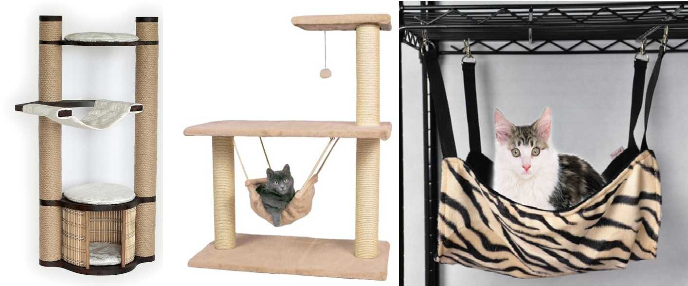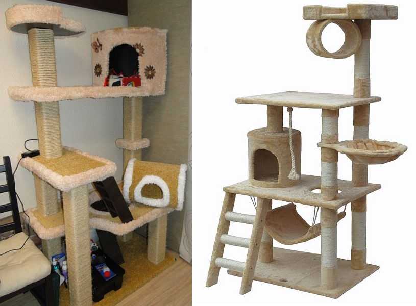 Игровые комплексы. Большие конструкции, в которых есть всё для полноценной жизни животного: когтеточки, домики, гамаки, полочки, подвешенные игрушки, лазейки и лестницы. Такие комплексы занимают много места.