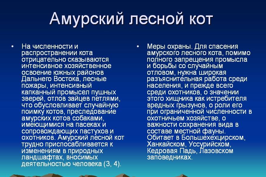 Амурский лесной кот – ближайший родственник более известной бенгальской кошки, которая обитает немного южнее. Известно об этих жителях тайги очень мало. Амурские коты занесены в Красную книгу как вид, который находится под угрозой исчезновения. Насколько это соответствует действительности, ученые сказать не могут. Собственно и занесли животное в красный список только потому, что о его численности нет точных данных.