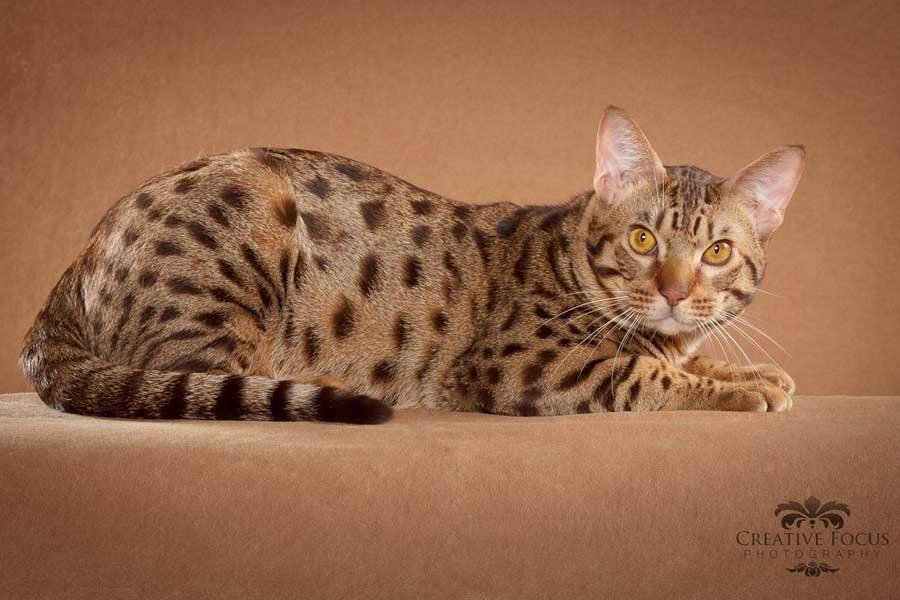 - Шоколадный. На светлом бежево-желтоватом фоне локализованы каштаново-шоколадные отметины. Подушечки лап оцикета окрашены в розовый цвет. Мочка носа – нежно-розовая с коричневой окантовкой.