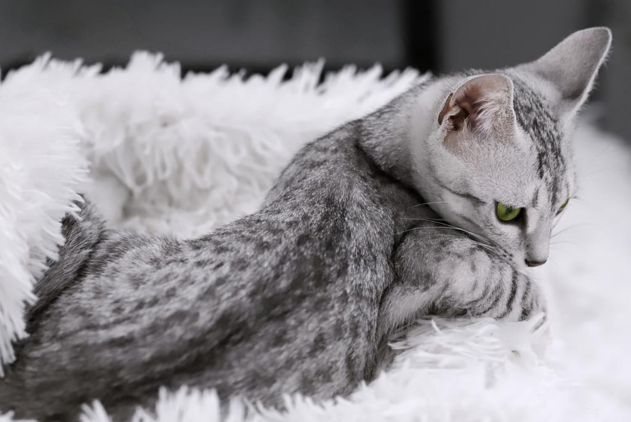 | шерсть | короткая, плотная, мягкая, шелковисто переливающаяся, подшерсток отсутствует, для породы характерен тикинг – разделение остевой шерстинки поперечно на несколько цветовых полос, пятна табби насыщенные, контрастные |