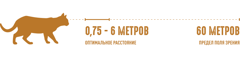 Кошачьи способны видеть предметы на расстоянии 60 метров. Оптимальное расстояние для кошачьего глаза составляет от 75 см до 6 м. Если во время охоты жертва находится на этом расстоянии, то кошка совершит прыжок из засады. Близко расположенные предметы для животного выглядят размыто. Распознать их помогают органы осязания.