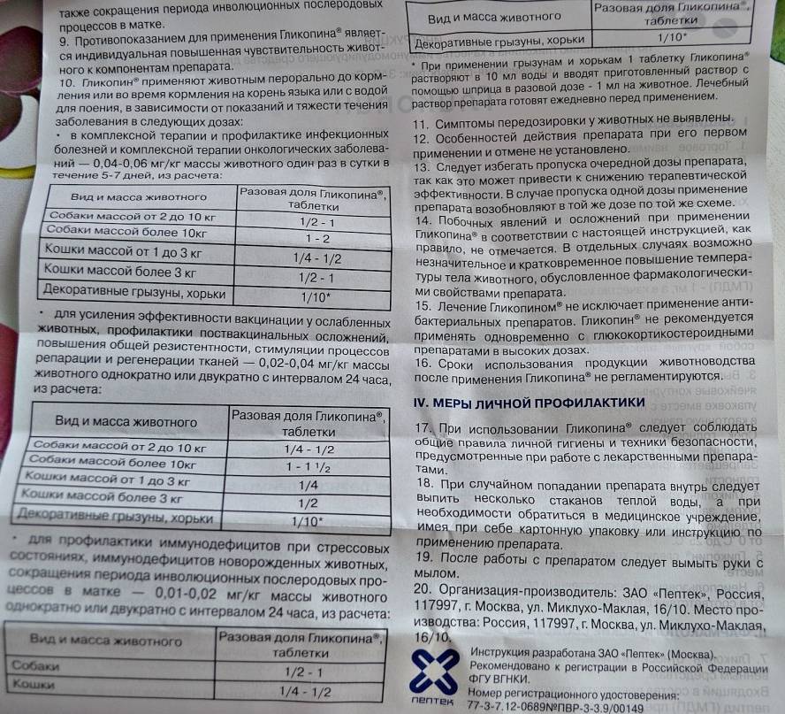 Чтобы блокировать паническое состояние или предотвратить инфицирование, достаточно однократного приема Гликопина в сутки. В первом случае прием производится в течение периода влияния неблагоприятных стрессовых факторов, во втором — курсом 5–7 (иногда 10) дней. При желании усилить эффективность вакцинации или устранить вызванные прививкой осложнения следует давать уменьшенную дозу — четверть таблетки кошкам с весом менее 3 кг и половину таблетки свыше данной массы тела.
