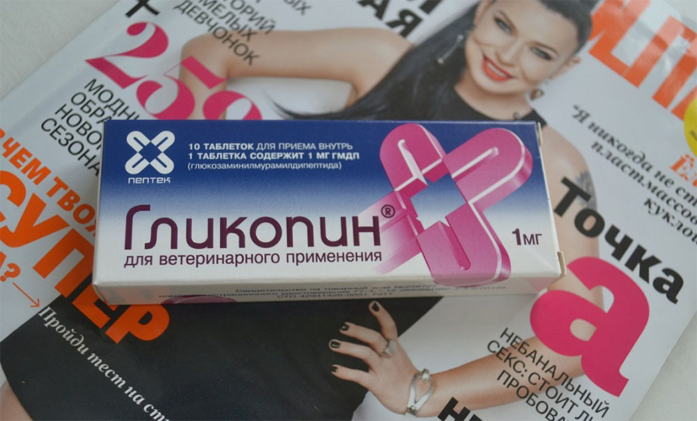 В состав Гликопина входит активное действующее вещество ГДМП (N-ацетилглюкозаминил-N-ацетилмурамоил-аланил-D-изоглутамин), который оказывает воздействие на иммунитет животного.