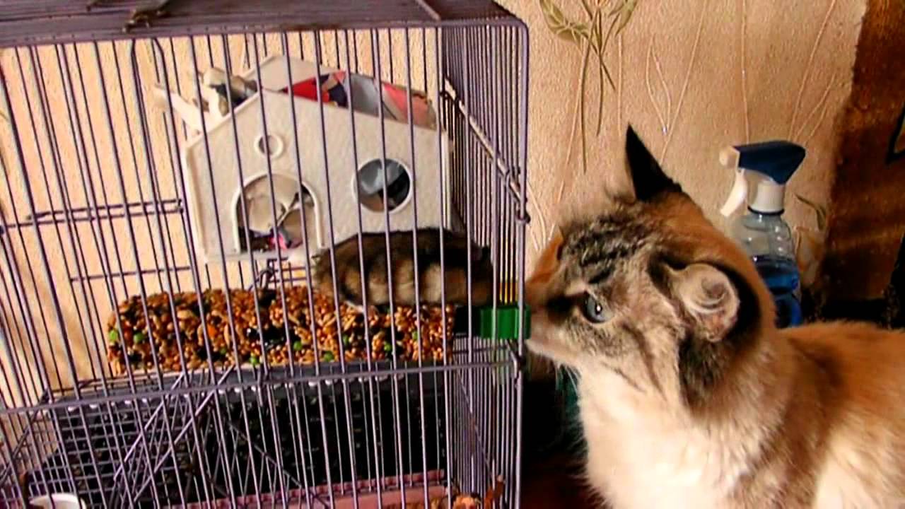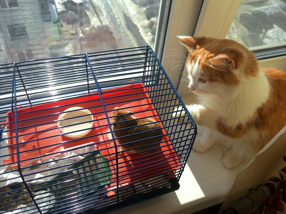 Пока зверьки еще не подружились, надо помнить о мерах предосторожности. При выходе с дома лучше запирать кота в отдельной комнате, чтобы он не смог пробраться к грызуну. Клетку лучше повесить вне досягаемости усатого, подобрать конструкцию с крепкими прутьями и надежным замком